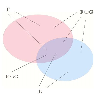 Nell'immagine seguente sono rappresentati due insiemi F (in rosa) e G (in azzurro), la loro intersezione e la loro unione.
